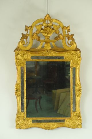 Glace à parecloses XVIIIème en bois doré, fronton ajouré à décor de vase fleuri et de pampres (accidents). 108 x 63 cm