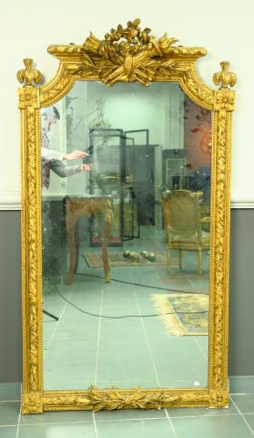 Glace de cheminée Napoléon III de style Louis XVI à décor de trophée. 159 x 88 cm