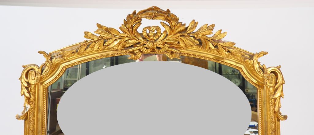 Glace de cheminée Napoléon III de style Louis XVI, en bois et stuc doré, petit fronton ajouré à décor de guirlandes de feuilles de laurier. Dim. 177 x 117 cm (petits accidents)