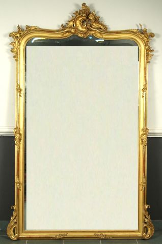 Glace de cheminée Napoléon III de style Rocaille en bois et stuc doré, à décor de feuillage et de fleurs. 195 x 120 cm.