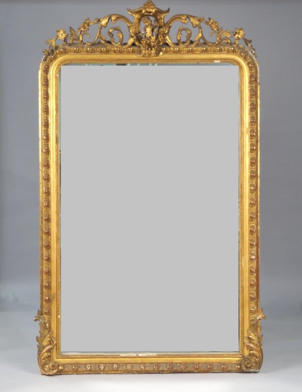 Glace de cheminée Napoléon III en bois et stuc doré à décor de perles et de godrons, surmonté d'un fronton ajouré agrémenté d'un amour et d'une guirlande de feuillage. 203 x 120 cm. (petits accidents)