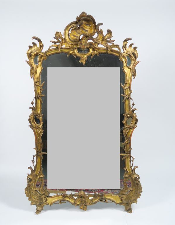 Glace de cheminée XIXème à parcloses de style Louis XV en bois et stuc doré, à décor de rinceaux feuillagés et de rocailles, fronton ajouré. 180 x 107 cm (petits manques)