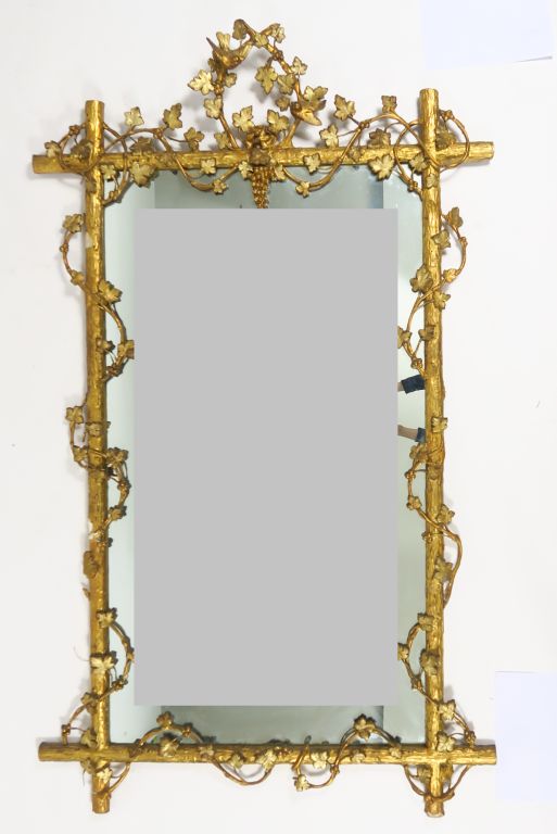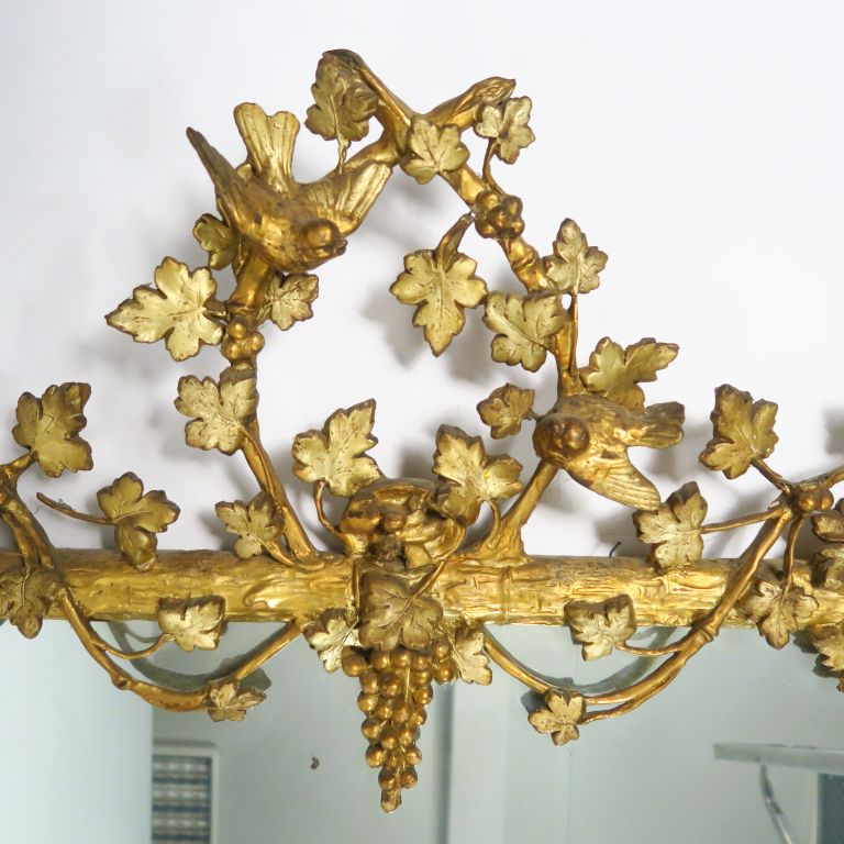 Glace fin XIXème en bois et stuc doré, à décor de pampres et d'oiseaux. Dim. : 181 x 106 cm. (accidents)