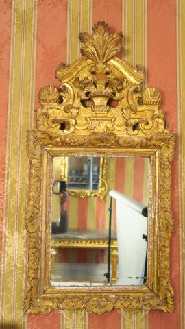 Glace Louis XV en bois sculpté et doré, à décor de rocailles et de feuillage, surmontée d’un fronton ajouré orné d’une palmette, de coquilles et d’un vase de fleurs (accidents) 127 x 64.5 cm