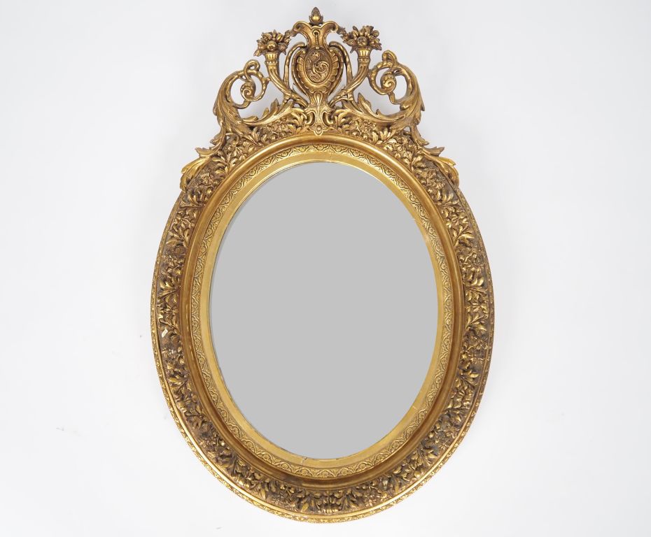 Glace médaillon de style Louis XVI en bois et stuc doré, à décor de fleurs et de feuillage, fronton ajouré. Dim. 99 x 71 cm (manques)