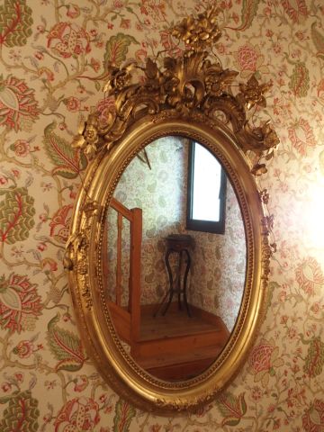 Glace médaillon Napoléon III en bois et stuc doré, fronton ajouré à décor de rocailles et de fleurs (accidents). Dim. : 120 x 75 cm