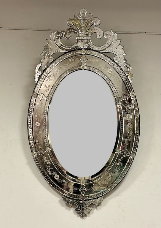 Glace ovale en verre de Venise 1900, à décor de feuillage, de fleurs et de pampres. Dim. 166 x 90 cm