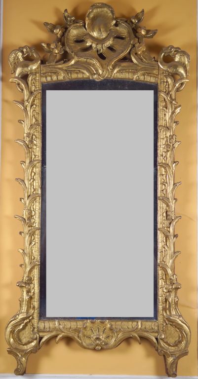 Glace Régence en bois sculpté et doré, à décor de rocaille ajourée, de griffons, de fleurs et de feuillage. 200 x 96 cm