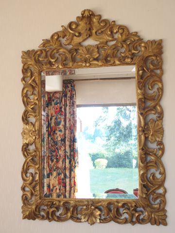 Glace XIXème en bois sculpté, doré et ajouré, à décor de feuillage et de palmettes (redorée). Dim. : 121 x 84 cm