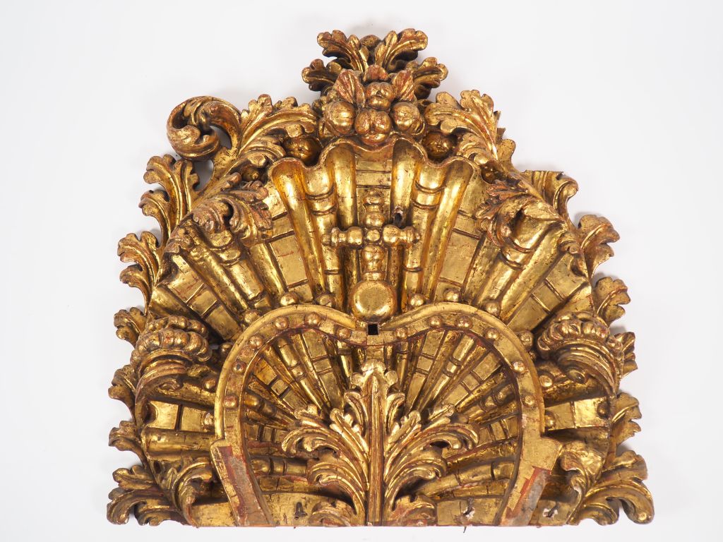 Grand bois doré fin XVIIIème en forme de coquille ornée d'une croix, de fruits et de feuillage. Dim. 90 x 94 cm