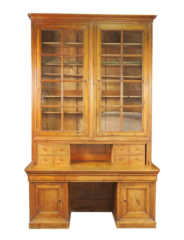 Grand bureau bibliothèque en pin, ouvrant à deux portes vitrées et huit petits tiroirs en partie supérieure et deux portes et trois tiroirs en partie inférieure. H. 2,61 m