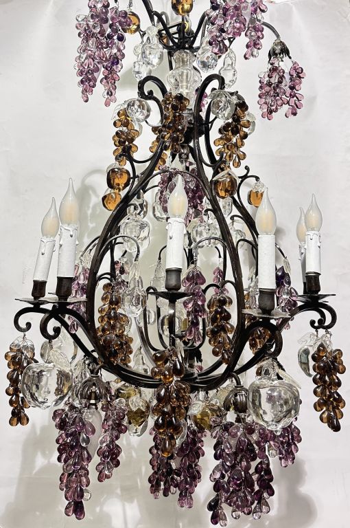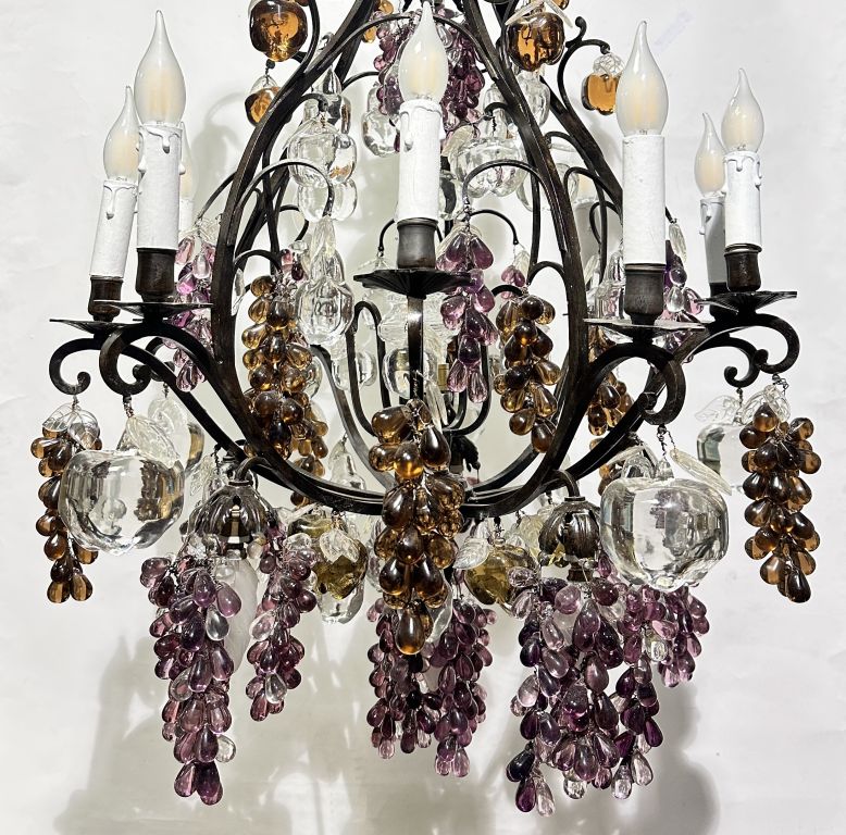 Grand lustre à pampilles en fer forgé et verre polychrome à décor de fruits éclairant à 16 lumières. H. 114 cm