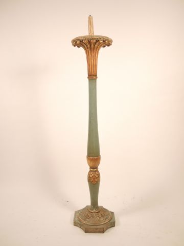 Grand pique cierge XIXème en bois laqué vert et doré H. 161 cm (accidents)