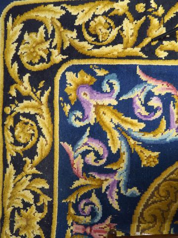 Grand tapis de style Louis XVI à décor de rinceaux et de fleurs sur fond bleu (usures) on y joint un petit tapis de prière