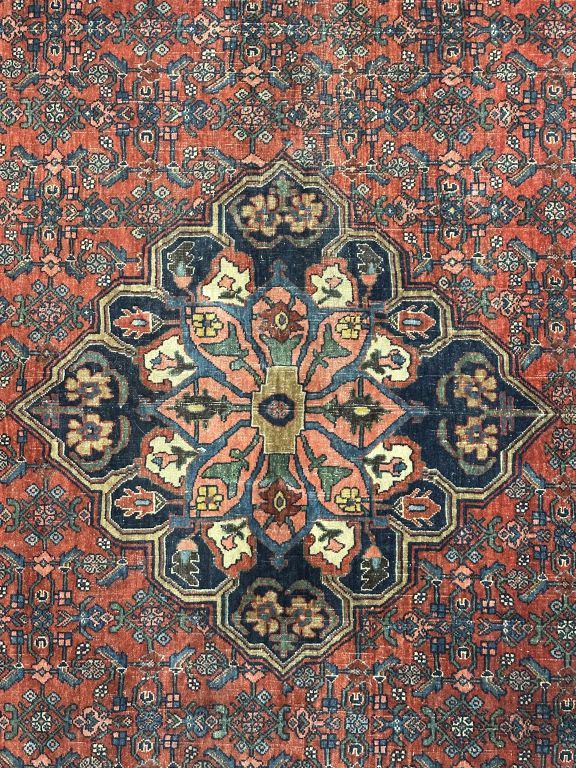 Grand tapis d'Orient à fond rouge. Dim. 2,75 x 3,63 cm. (accident)