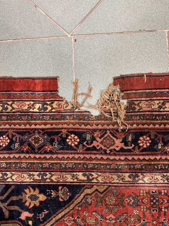 Lot de Grand tapis d'Orient à fond rouge. Dim. 2,75 x 3,63 cm. (accident) au prix de 300 à 500 € en vente aux enchères par l'hôtel des ventes Primardeco