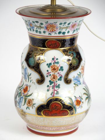 Grand vase balustre XIXème en porcelaine à décor de fleurs polychromes de Bayeux (un éclat) , monté en lampe. H. 37 cm