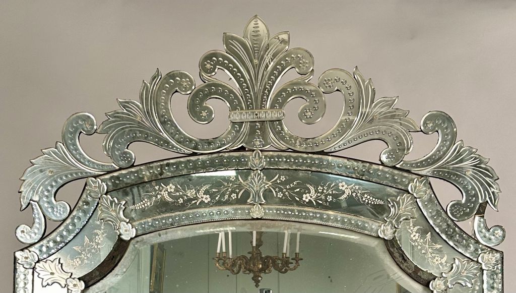 Grande et spectaculaire glace de cheminée en verre de Venise, à décor de feuillage, de fleurs et de pampres. Dim. 250 x 141 cm (deux petits manques)