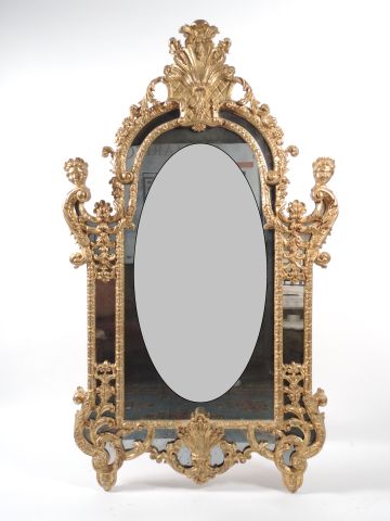 Grande glace à parecloses de style Régence en bois et stuc doré, à décor d'amours, de rinceaux et de personnages Dim. 173 x 102 cm (redorée)