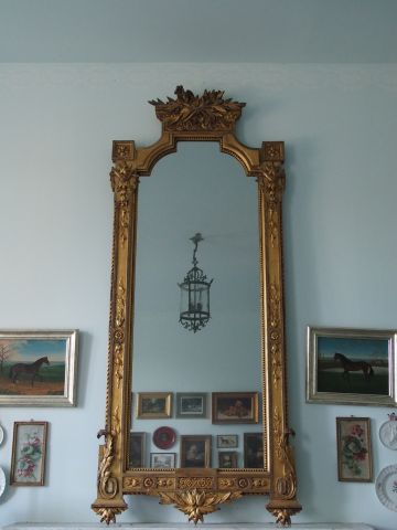 Grande glace de style Louis XVI en bois et stuc doré à décor de laurier et de perles. 240 x 104 cm