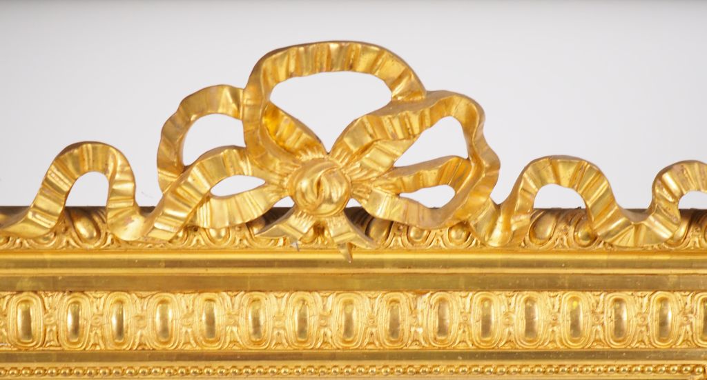 Grande glace en bois et stuc doré, de style Louis XVI à décor de frise de perles, de nœuds de rubans et de pommes de pin. Dim : 189 x 105 cm