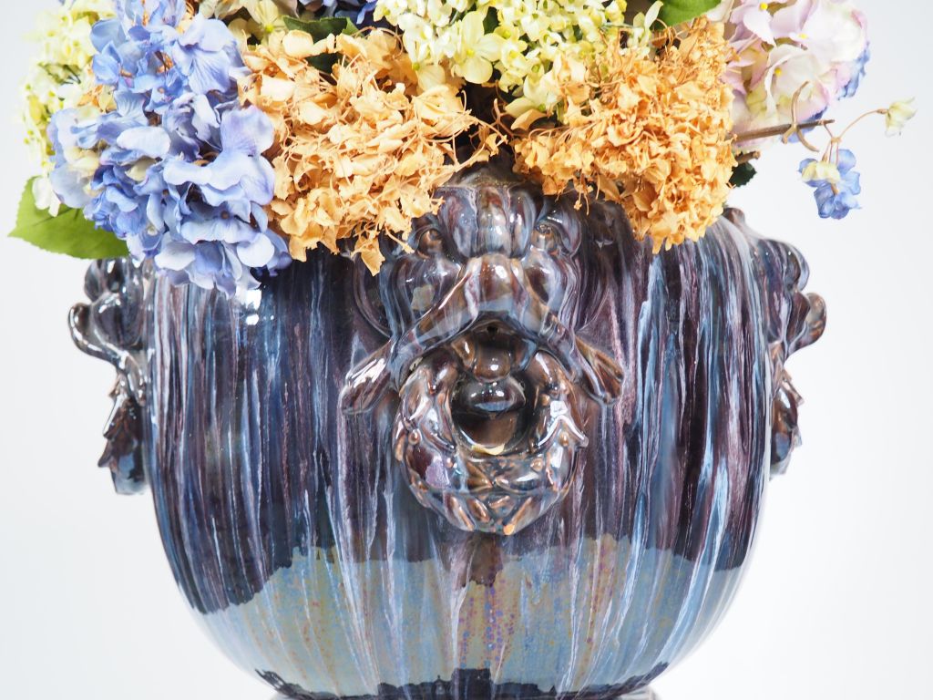 Grande jardinière 1900 en céramique polychrome à décor de mufles de lion. H. 93,5 cm.