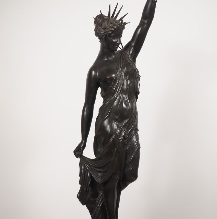 Grande porte-torchère fin XIXème - début XXème en fonte à patine noire, "la Liberté" ou "allégorie de la nuit". Sur sa base en forme de colonne facettée, éclairant à une lumière. H. totale avec le socle : 227 cm H. 138 cm