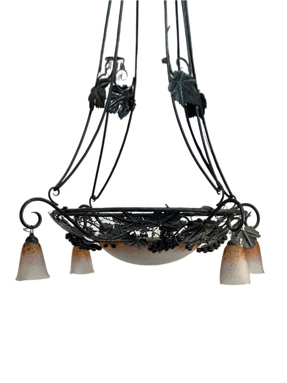Grande suspension de salle à manger Art Déco en verre marbré blanc et orangé, éclairant à 5 lumières. Monture en tôle et fer forgé à décor de pampres H. 170 x 115 cm
