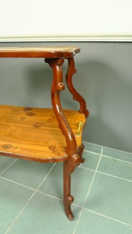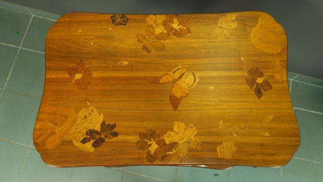 Guéridon Art nouveau en marqueterie à décor de papillons et de feuillage.