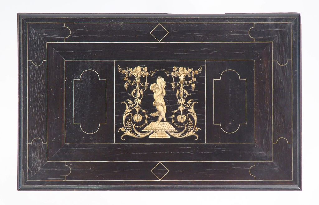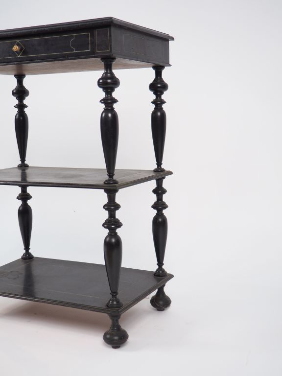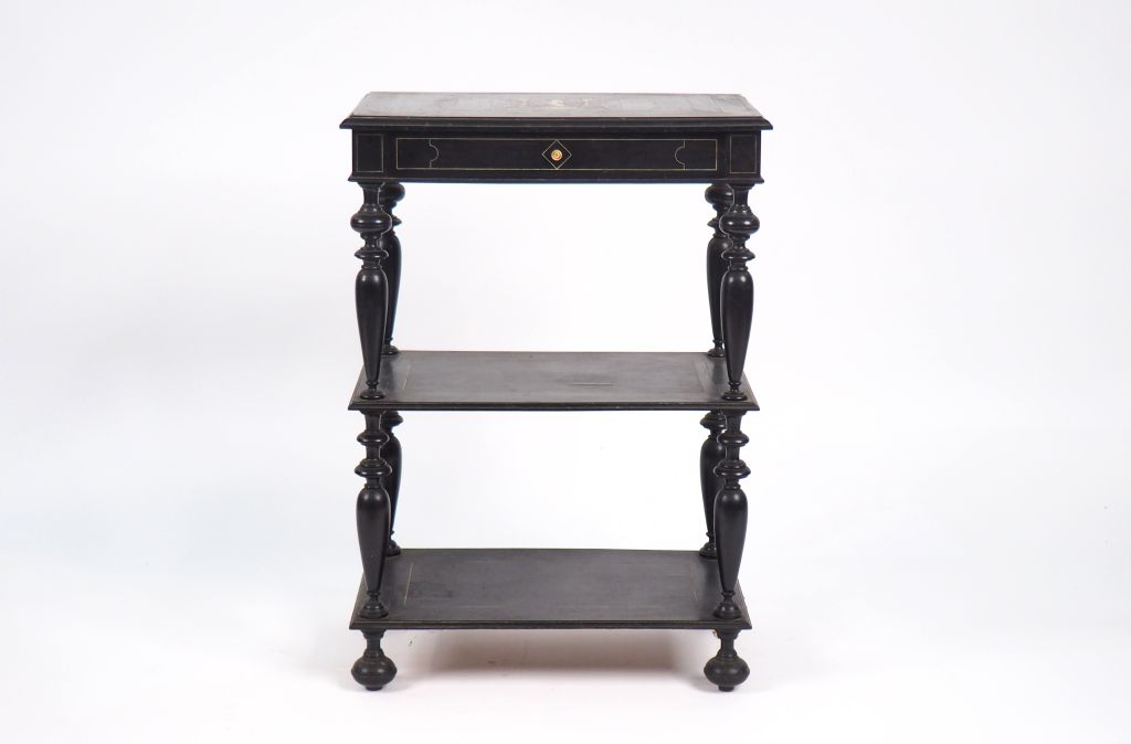 Guéridon de style italien fin XIXème en marqueterie et placage de bois noirci à trois plateaux et un tiroir, montants à balustre. Dim. 75 x 53 x 33,5 cm