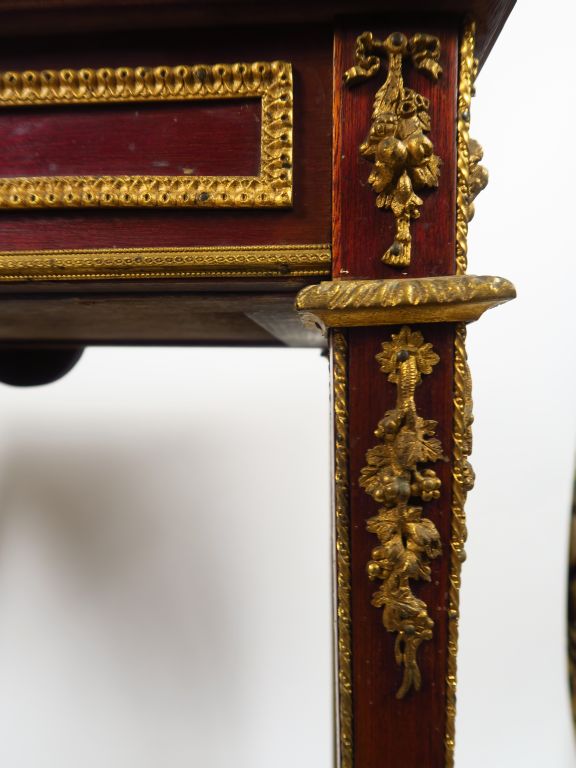 Gueridon de style Louis XVI en acajou et placage d'acajou, orné de deux médaillons en Wedgwood. Dessus marbre brèche encastré. 80 x 67 x 42,5 cm (accident au marbre)