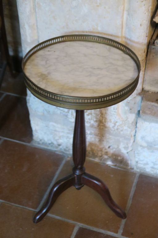 Guéridon tripode en acajou et placage d'acajou, plateau et marbre à galerie. H. 60 cm.