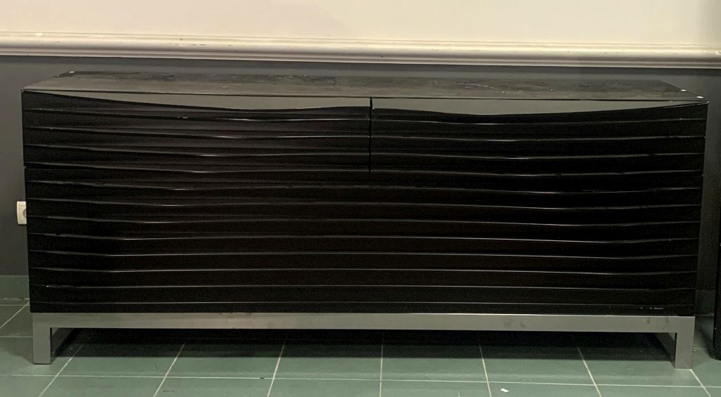 HORM. Buffet en bois laqué noir, piétement chromé, ouvrant à deux tiroirs et un grand abattant. Dim. 80 x 192 x 60 cm