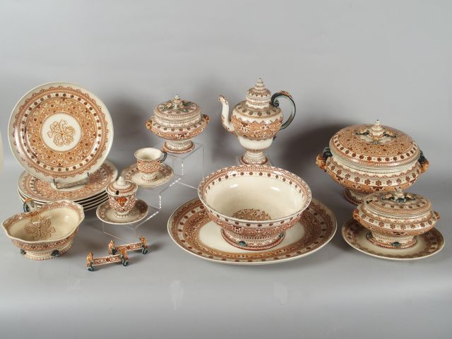 Important service de table en faïence fine de Longwy, modèle Henri II, décor en camaïeu ocre et vert
