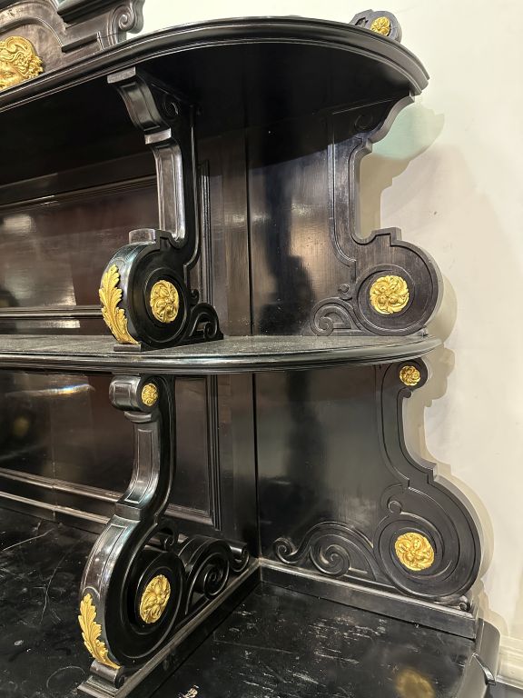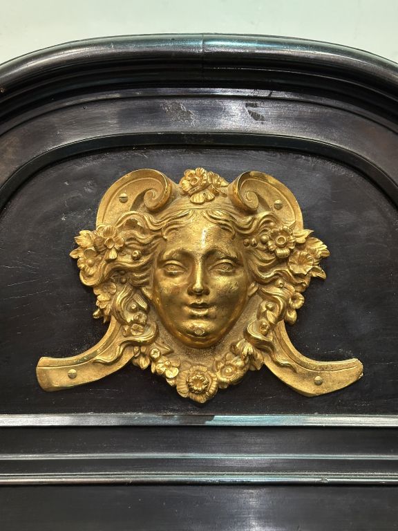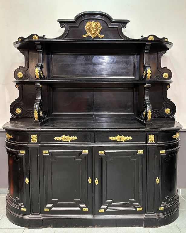 JANSELME. Buffet de style Louis XVI en bois noirci, belle ornementation de bronze doré, à décor de masques, de jeune fille et de feuillage. Dim. 230 x 200 x 55 cm