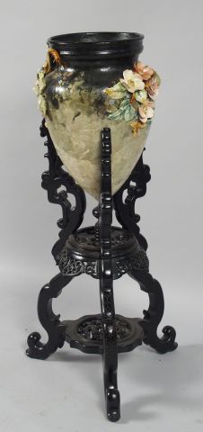 Jardinière Napoléon III en barbotine à décor de fleurs en relief, piétement tripode en bois noirci (petits accidents). H. : 48 cm, H. avec piétement: 105 cm.