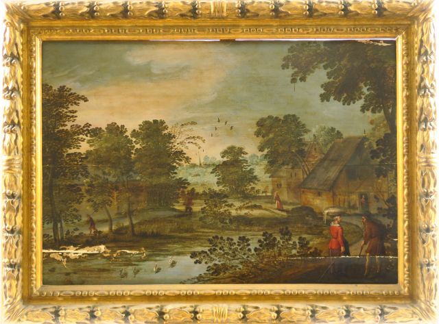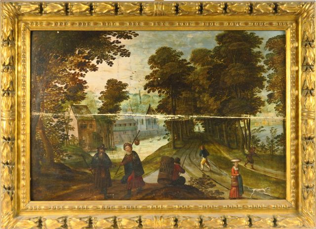 Jasper van der LAANEN (Attribué à) (1592 - 1629) Paysage au château animé de figures A l'entrée du village Paire de panneaux de chêne, deux planches, non parquetés 49 x 72 cm Au revers de chaque panneau, la main d'Anvers au revers d'un des deux panneaux : 1792/ Galerie Royale Expert : Cabinet Turquin