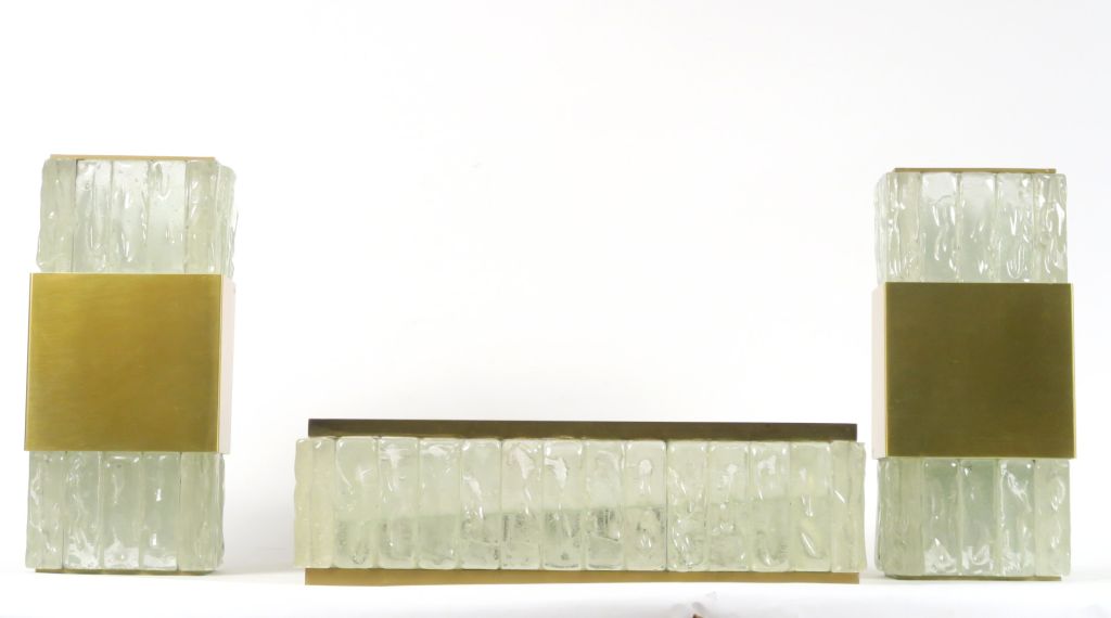Jean PERZEL. Paire d'appliques et plafonnier en verre et métal brossé. Appliques signées. H. des appliques : 35 cm Dim. du plafonnier : 13 x 44 cm