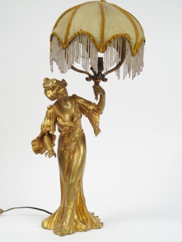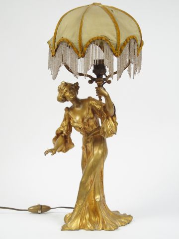 Lampe Art Nouveau en bronze doré figurant une jeune fille en robe longue. Abat-jour d'origine en soie verte (fendu). H. : 33 cm.