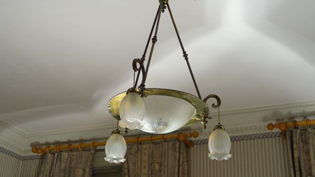 Lot de Lustre 1900 en verre et laiton éclairant à quatre lumières au prix de 80 à 120 € en vente aux enchères par l'hôtel des ventes Primardeco