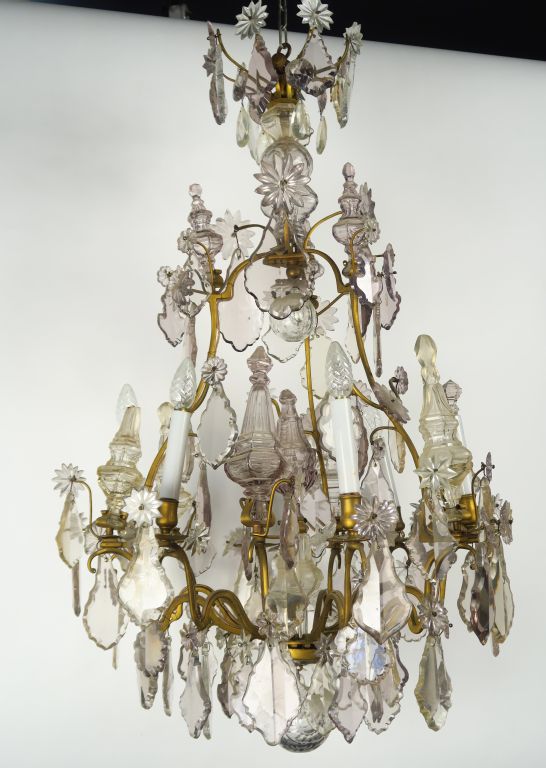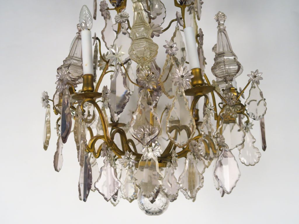 Lustre à pampilles en cristal légèrement teintées mauves. Eclairant à 6 lumières. H.110 cm (accidents)