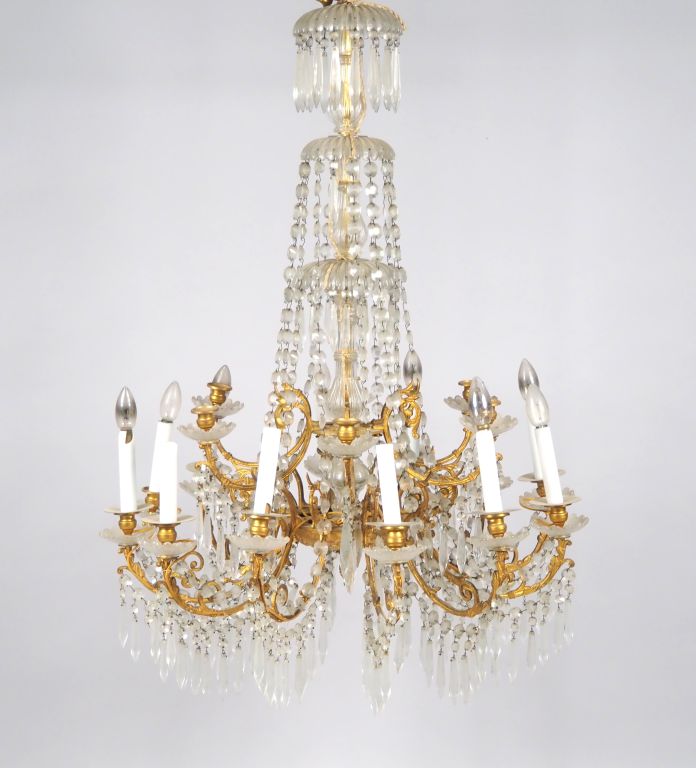 Lustre à pampilles fin XIXème en métal doré et cristal, éclairant à dix huit lumières et une paire d'appliques assorties, éclairant à trois lumières.
