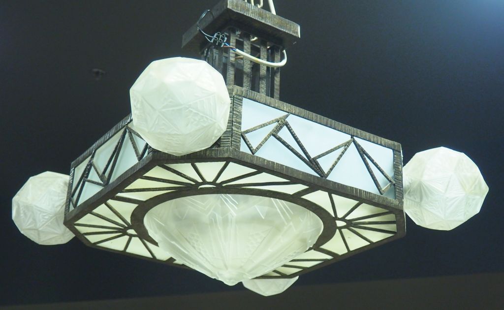 Lustre Art Déco en fer forgé et verre sablé à décor de motifs géométriques. Eclairant à 5 lumières. Dim. 47 x 67 x 67 cm.