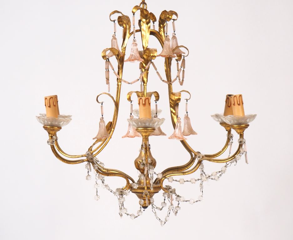 Lustre Napoléon III en tôle dorée et verre polychrome, à décor de fleurettes, éclairant à six lumières. Dim. 52 cm (manques)
