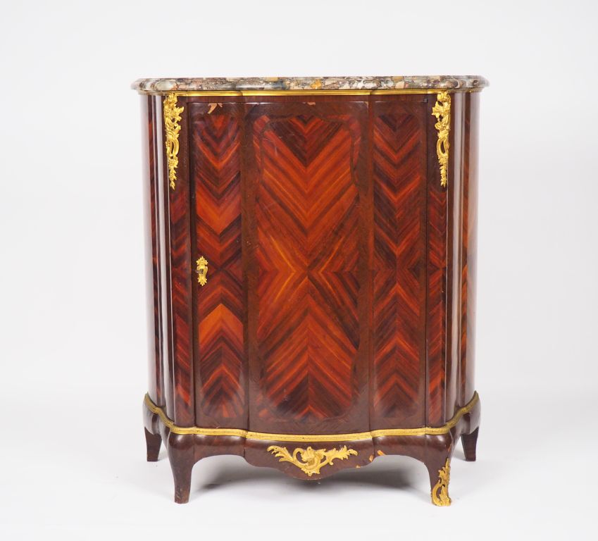 Meuble d'appui de style Louis XV en marqueterie ouvrant à une porte galbé sur les 3 cotés, dessus marbre brèche, ornementation de bronze doré. (petit accident à la marqueterie) Dim. 111 x 45 x 100 cm