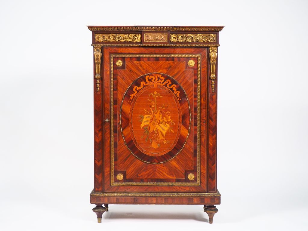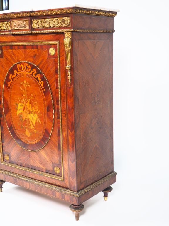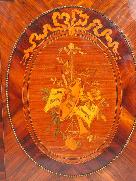 Meuble d'appui Napoléon III de style Louis XVI en marqueterie, à décor dans une réserve ovale de trophée d'instruments de musique. Riche ornementation de bronze et de laiton doré. Dessus marbre blanc. Dim. 107 x 73 x 39 cm