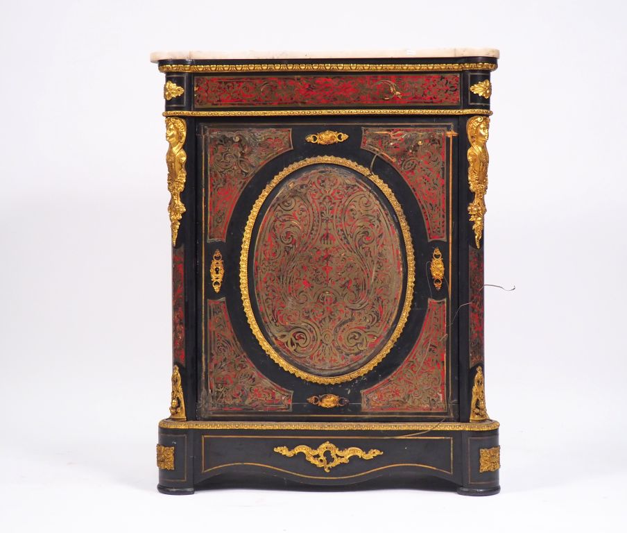 Meuble d'appui Napoléon III en marqueterie boulle écaille rouge et laiton, ouvrant à une porte, dessus marbre blanc. Dim. 107 x 85 x 43 cm (accidents au laiton, manques)
