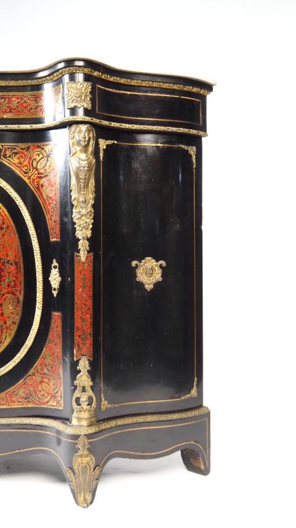 Meuble d'appui Napoléon III en marqueterie, facade et cotés violonnés ouvrant à une porte, ornementation de bronze et laiton doré à décor d'espagnolettes. Dim. 98 x 115 x 42,5 cm (petits accidents)