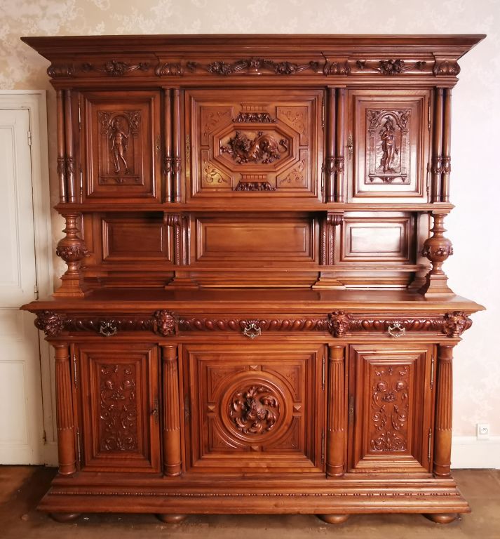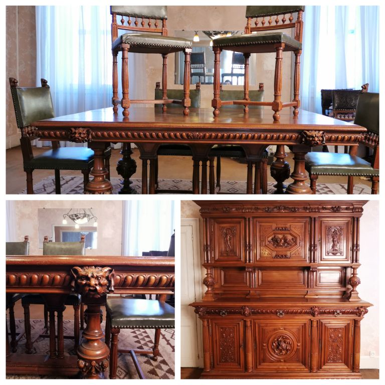 MILHAU à Carcassonne. Ensemble de salle à manger Fin XIXème - début XXème de style Henri II en noyer richement sculpté. Comprenant : - Une table à décor de godrons et de têtes de gargouilles. Dim. 160 x 123 x 73 cm. - Six chaises à décor ajouré de consoles, garniture de cuir vert. - Un buffet deux-corps à décor de femmes à l'antiques dans des réserves. Dim. 190 x 135 x 50 cm. Vendu Sur désignation (ville de Carcassonne)