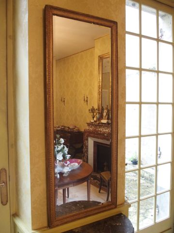Miroir de style Louis XVI en bois sculpté et doré, à décor de perles et de rais de cœur, glace biseautée. Dim. : 156 x 60 cm